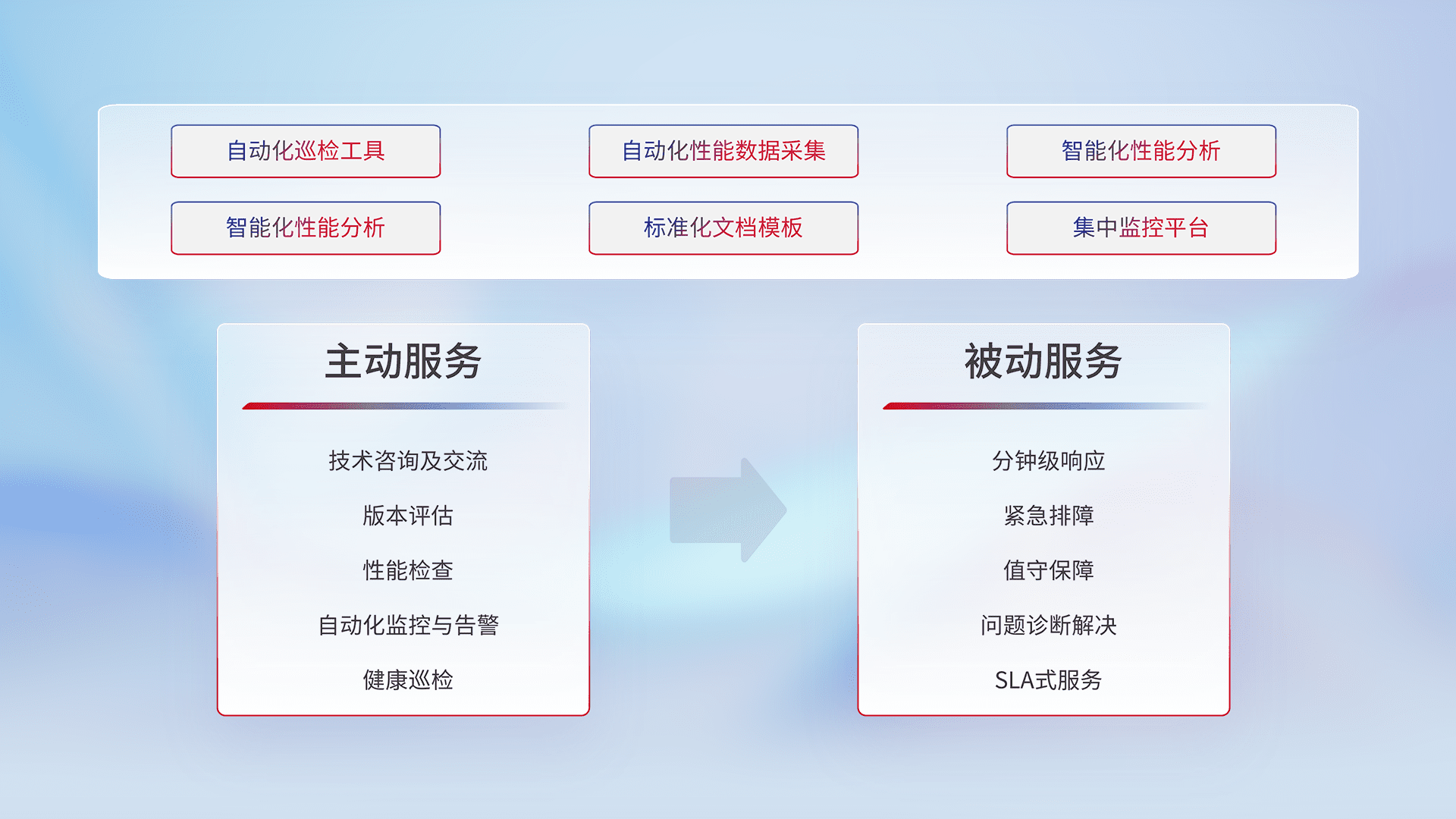 智能化工具和标准化文档,,,保障服务质量,,,提供主动服务(包含技术咨询、、版本评估、、、、性能检查、、自动化监控与告警、、、、健康巡检)和被动服务包含(分钟级响应、、、、紧急排障、、值守保障、、问题诊断解决、、、SLA服务)。。。。