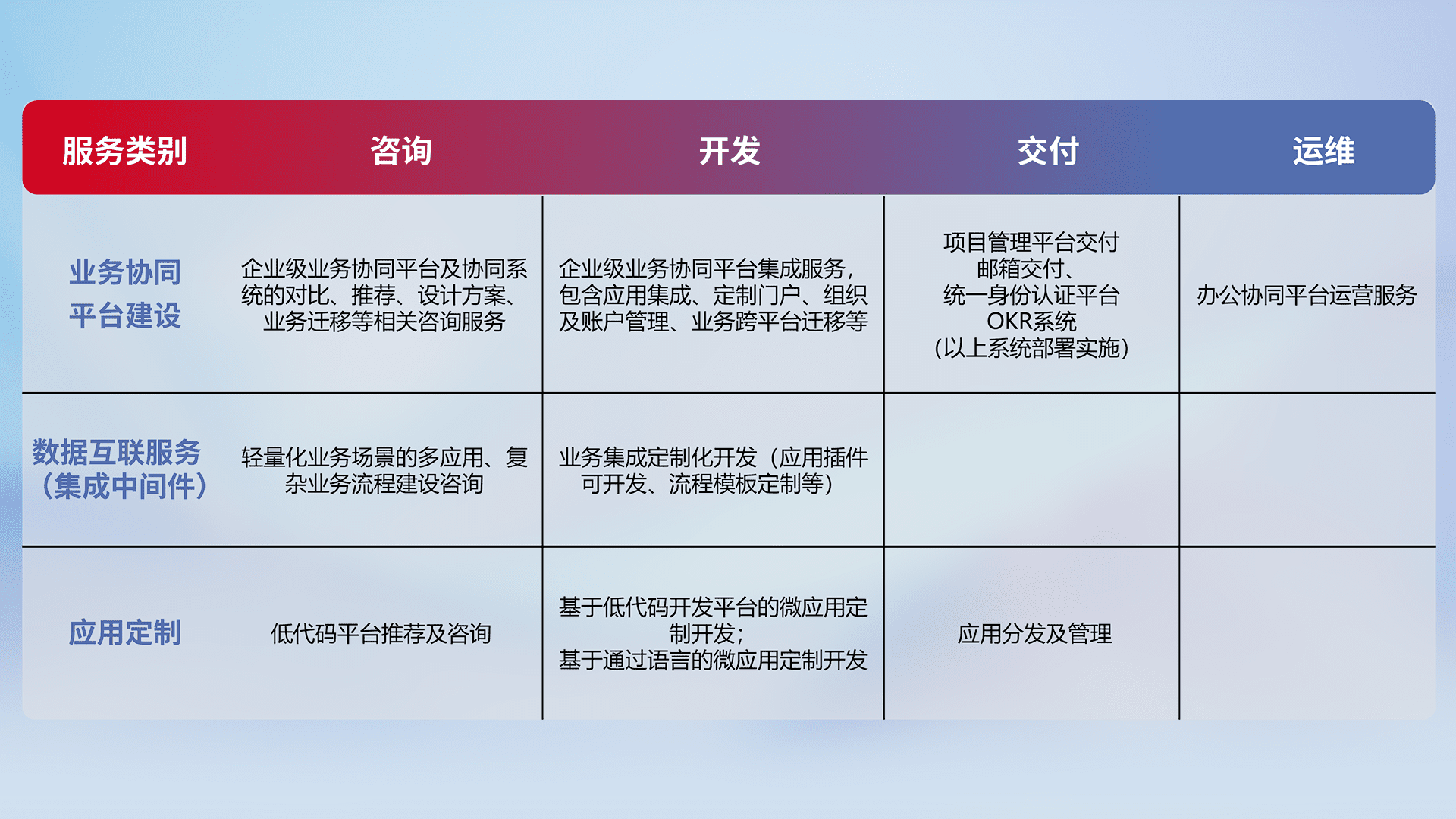 针对钉钉、、、、企微、、、IDaas等平台级产品提供产品的规划、、方案、、、交付、、、定制化开发等服务,,,实现如统一协同办公、、、智能客户服务、、、混合会议管理、、、智能数据查询、、等业务场景,,,实现数字化转型。。。